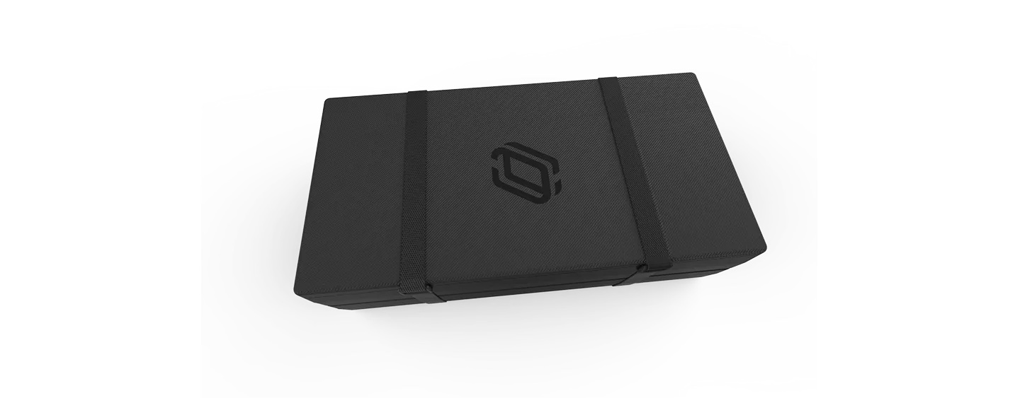Het materiaal van de koffer is carbon kleurig met zijkanten van vegan leer, met geborduurd logo aan de bovenzijde en microfiber naden aan de binnenkant. De koffer heeft ook draagriemen aan de voorkant en handgrepen aan de achterkant, eveneens gemaakt van vegan leer.